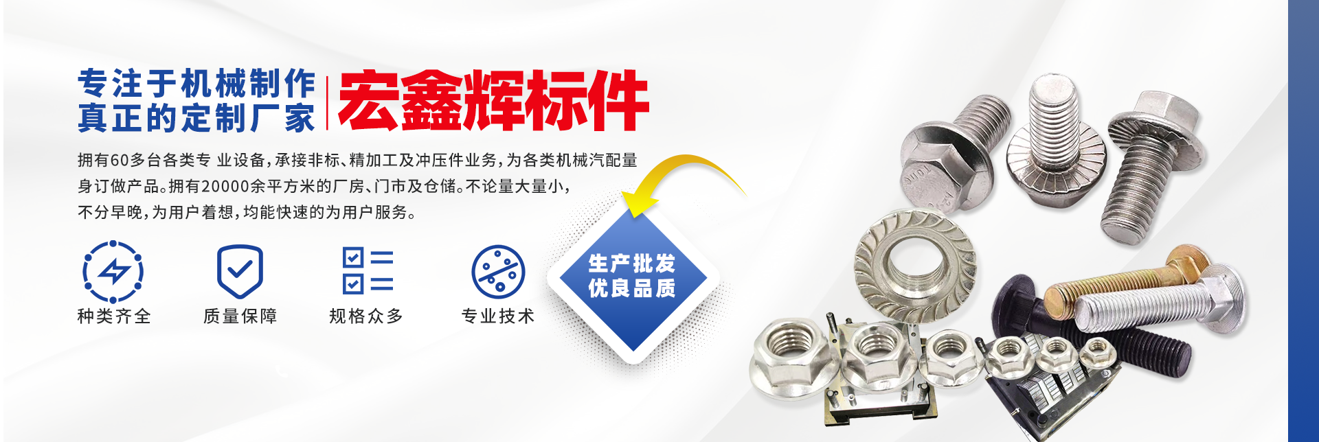 四川宏鑫輝標準件制造有限公司下設:南充市宏輝機械制造有限公司,南充市聚宏機電設備有限公司,公司始建于1994年。為了拓展市場,降低成本,本公司于2007年、2020年分別在南充、 成都、重慶創(chuàng)建了生產(chǎn)基地。擁有60多臺各類專 業(yè)設備,承接非標、精加工及沖壓件業(yè)務,為各 類機械汽配量身訂做產(chǎn)品。擁有20000余平方米的廠房、門市及倉儲。公司以誠信為本,竭誠為廣大客戶提供服務。不論量大量小,不分早晚,為用戶著想,均能快速的為用戶服務。 公司所生產(chǎn)及代理的產(chǎn)品為業(yè)界人士公認的國內(nèi)、國際優(yōu)等品牌。在產(chǎn)品性能與質(zhì)量